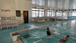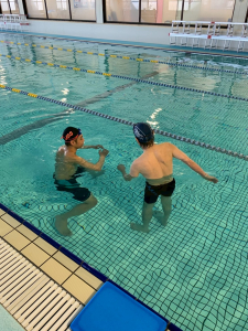 水中、陸上で泳法の動画を撮影し