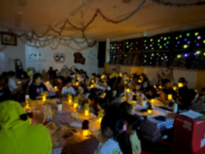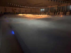 そして最後はクリスマス会のメイン、キャンドルサービスです!普段泳いでいるプールが幻想的に彩られます