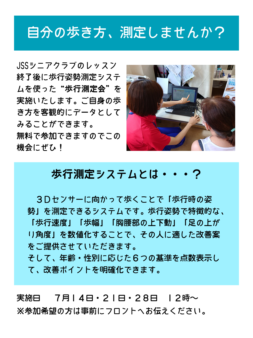 JSSシニアクラブのレッスン終了後に歩行姿勢測定システムを使った「歩行測定会」を実施いたします!