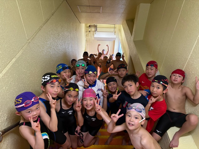 最後に行われた「コーチとガチ対決リレー」では写真の和やかムードとは打って変わって最後の最後まで大接戦🏊(コーチ陣はしっかりトレーニングしようね)