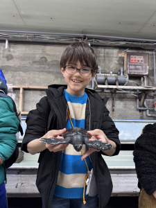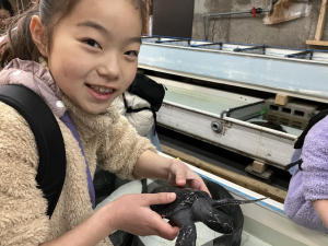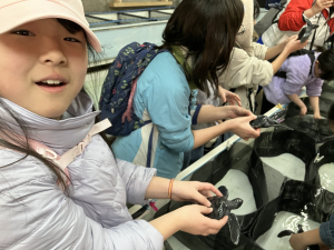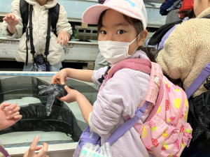ウミガメの赤ちゃんを触ったり、飼育員の方にイルカたちに与えている魚の説明がありました😌