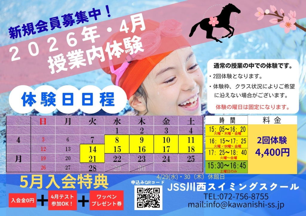 4月授業内体験の日程が決定いたしました!新しい習い事、初めての習い事には全身運動のスイミングスクールがオススメです♪