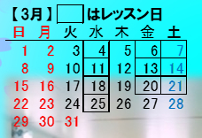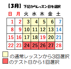 下記カレンダーの黄色より3回通常レッスンを選択、テスト期間(赤色)より1回選択していただきます。