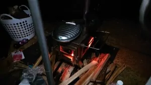 テントの中に『薪ストーブ』を入れて、暖をとります!上には「湯たんぽ」を温めて寝袋にいれます。この薪ストーブはとっても暖かくなりテント内は15℃近くまで上がるのですが、難点が1つ…薪が大量に必要となります![]()