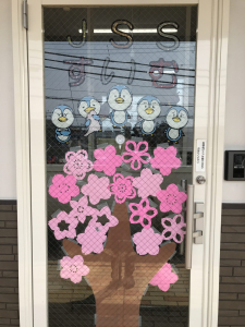 出来上がった作品たちを、玄関前に集めて扉一面、満開の桜が咲きました🌸🌸