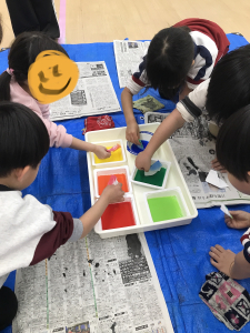 コーヒーフィルターに、色が広がっていく様子をみて子どもたちも興味深々😳!